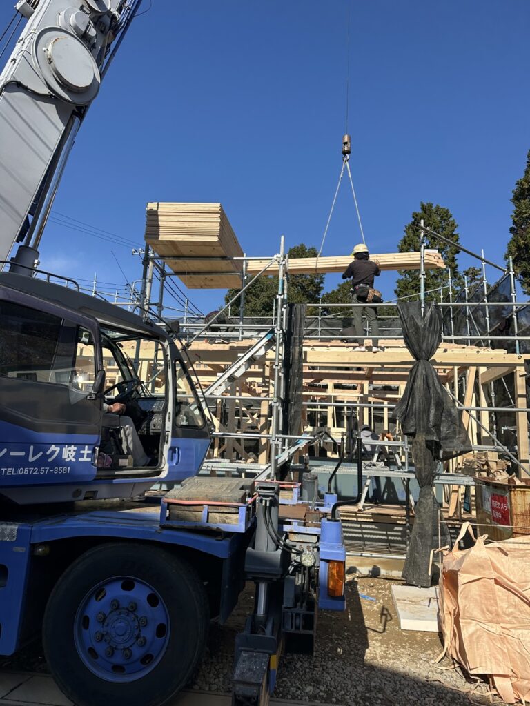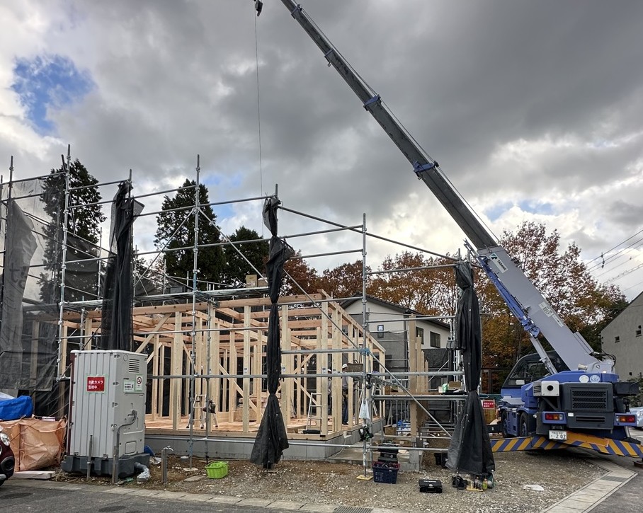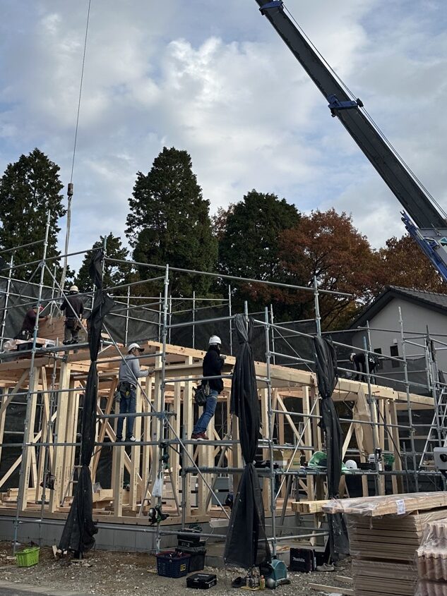 肌寒くなった時期ですが、天気にも恵まれて職人さんの手際の良さでどんどん柱が立ち上がり、午前中のうちにほとんどの家の形が見えてきました。