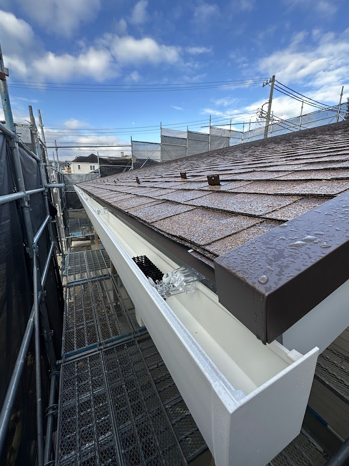エムスタイルホームでは、外観デザイン・動線・敷地条件を踏まえて、できるだけ目立たず、使いやすい位置になるよう屋根工事の段階から雨樋計画を行っています。