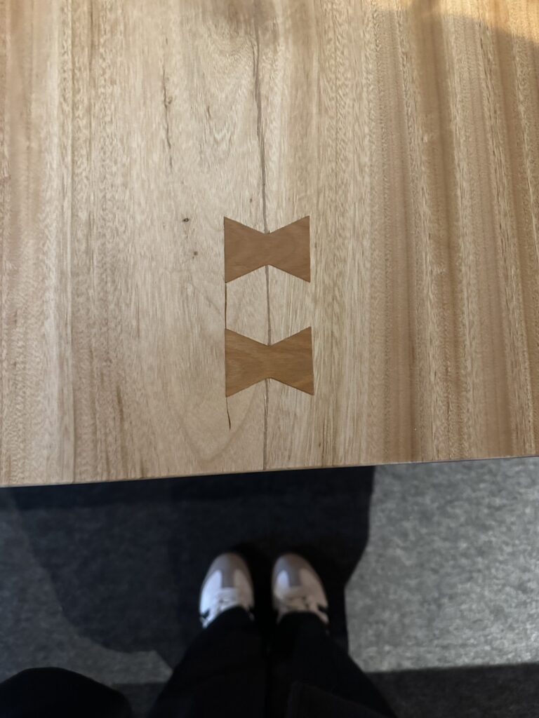 「千切り(ちぎり)」は、板の割れにリボン型(蝶型)の木片を埋め込んで、板の割れを防いだり接合したりする伝統的な技法なのです。
