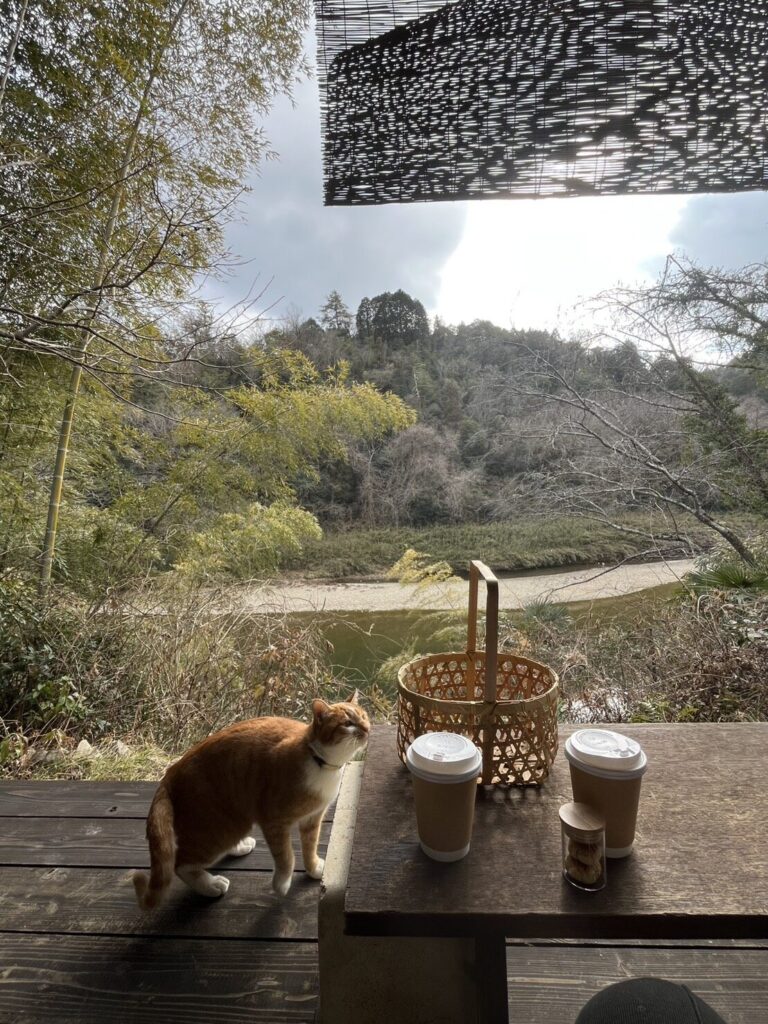目の前の川と山を眺めながらゆったりしていると、足元に気配を感じ、見下ろすとお客さんに慣れた懐っこいネコが見上げていてとても癒されました。