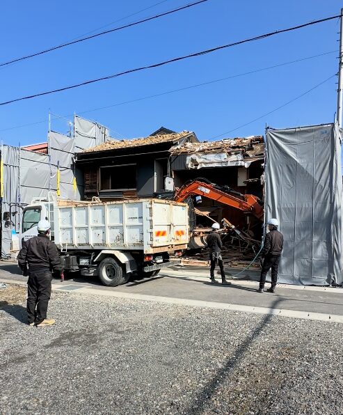 解体工事は、騒音への配慮や振動対策、近隣ご挨拶など慎重に進めていきます。特に今回は県道沿いということで、歩行者や車の通行には細心の注意をはらって行います。