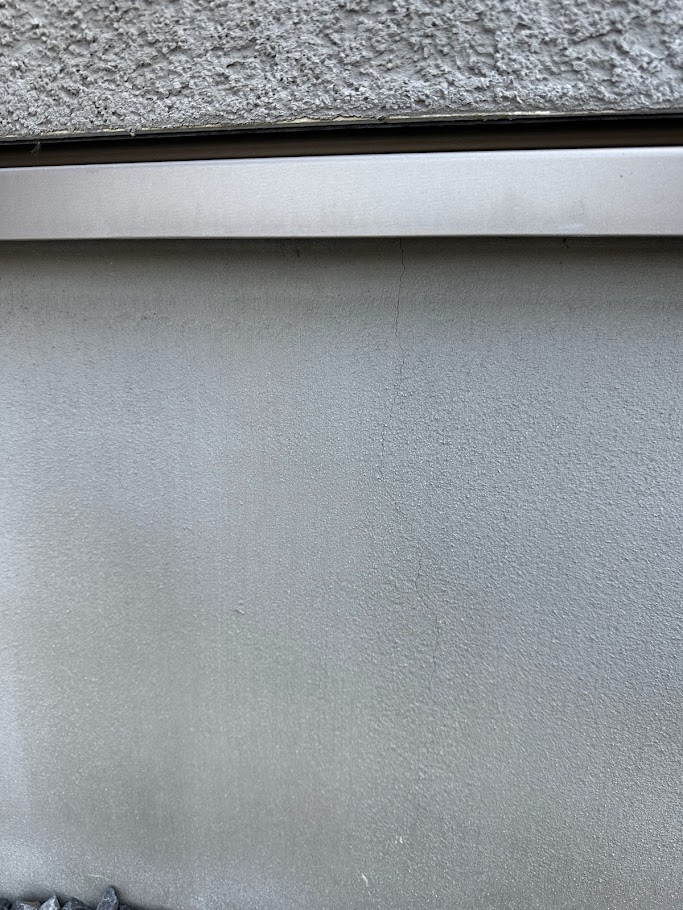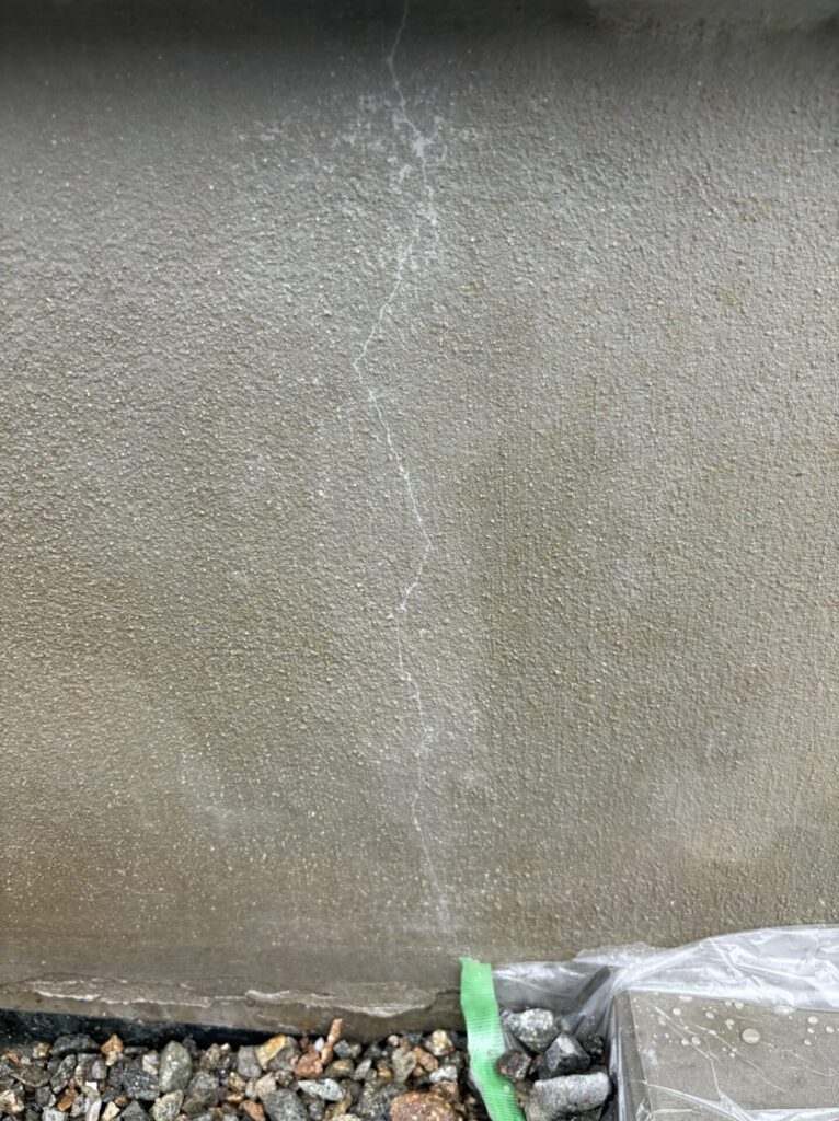 基礎の表面に、髪の毛のような細い線が入ることがあります。これは多くの場合、コンクリート表面の化粧モルタル(仕上げ材)の収縮によるヒビです。コンクリートは季節によっても乾燥する過程でわずかに縮むヒビが入ることがあります。メイクで例えるとファンデーションのヨレみたいなものです(笑)