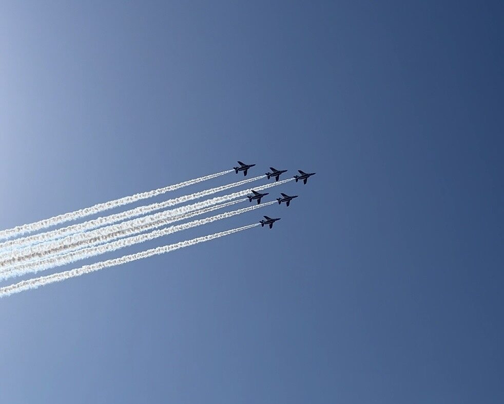 会場のアナウンスに従ってワクワクしながら待機していると、上空に現れた際まず驚いたのが“音”。体に響くような重低音が空いっぱいに広がって、綺麗にそろった飛行。圧巻でした。