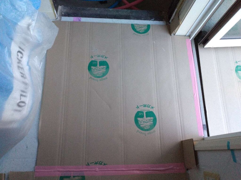 浴室解体前の準備として、作業中に壁や床を傷付けたり汚したりしないよう、脱衣室や廊下を保護をします。