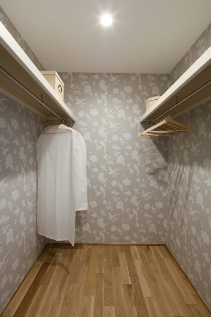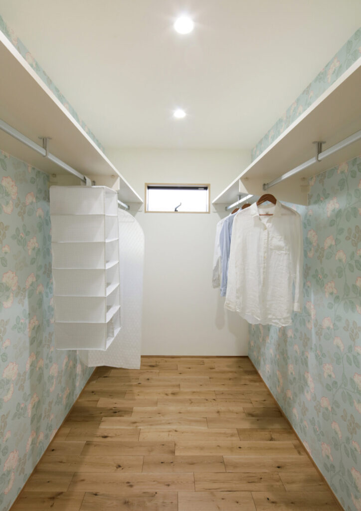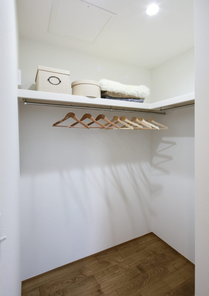 通常のクローゼットより広く、ハンガーパイプや棚を自由に設置でき、衣類だけでなく、バッグや帽子、靴などの小物もまとめて収納できるため、家の中をスッキリ保つことができます。
