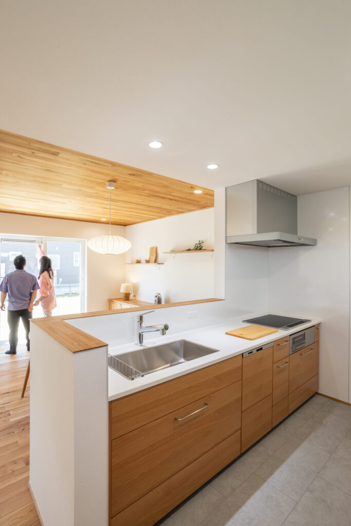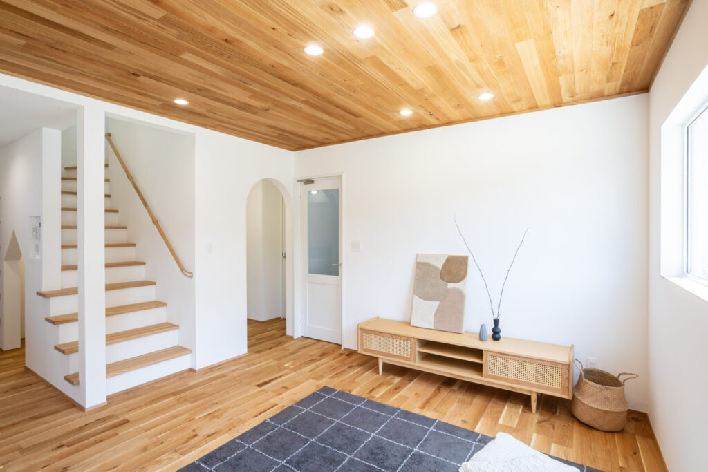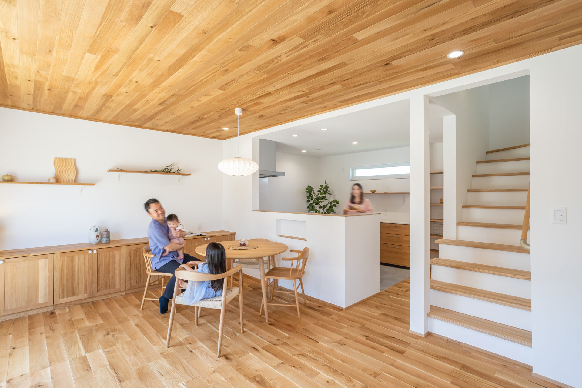 内装のイメージは、妻のかねての希望通り「カフェ風」で。こちらも白を基調にして、木のぬくもりを感じられる空間に仕上げてもらいました。天井にも木を使いたいとお願いしたのは、エムスタイルホームさんの事務所を見て「これ素敵だな」と思ったからです。