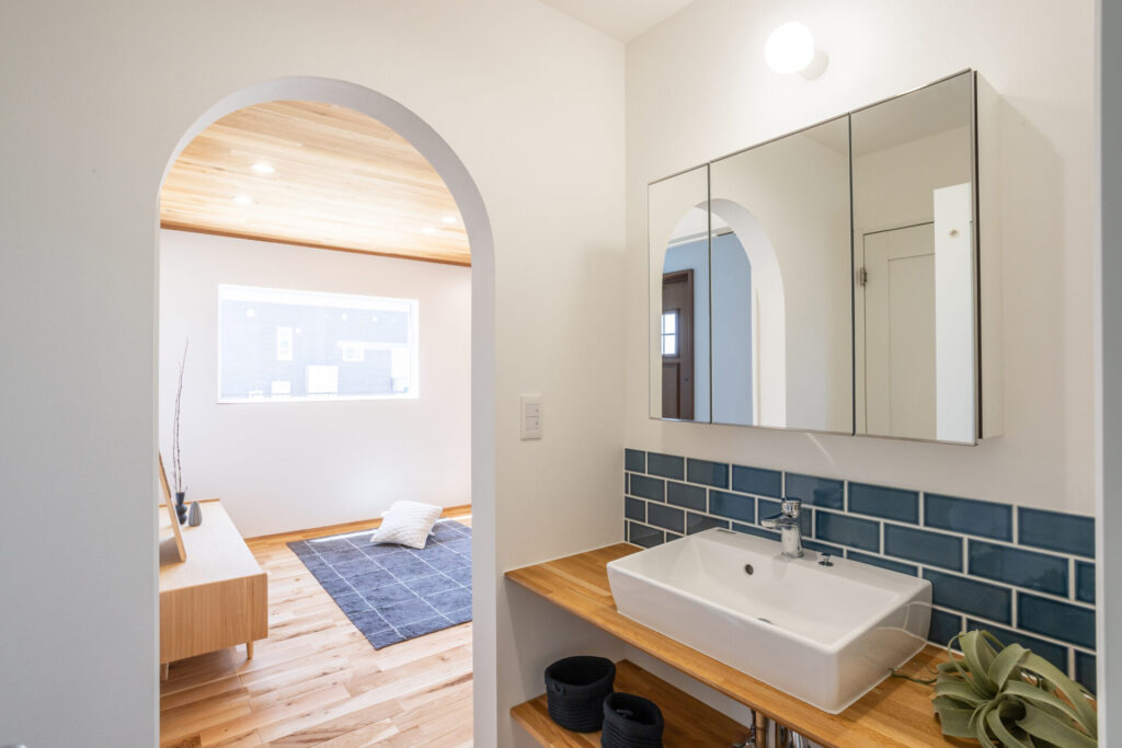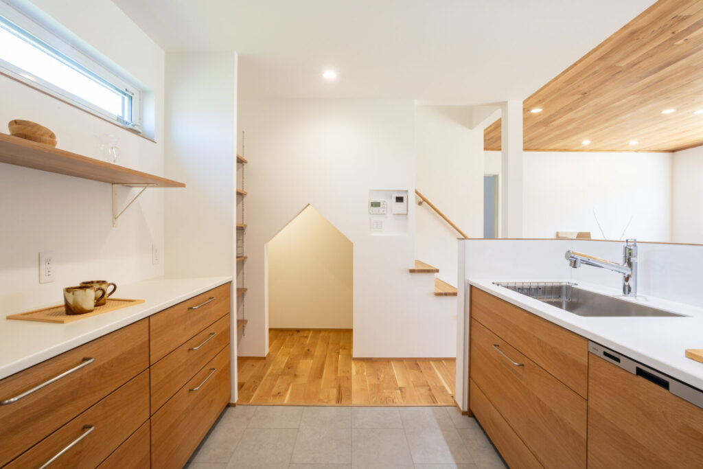 ほかにも、洗面所のアール型の開口や、階段下の三角形の小さな空間など、可愛らしいデザインをたくさん取り入れてもらいました。本当は収納にするつもりだった階段下のスペースは、今は子どもたちの遊び場になっています。キッチン周りも、使いやすさと見た目のバランスを考えて、造作の食器棚をお願いしました。