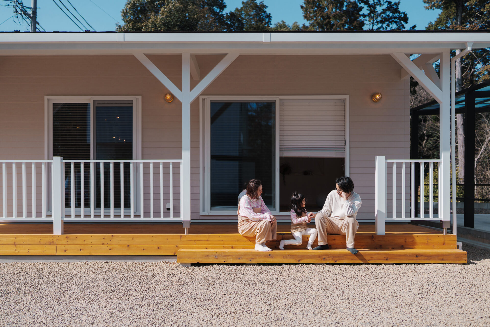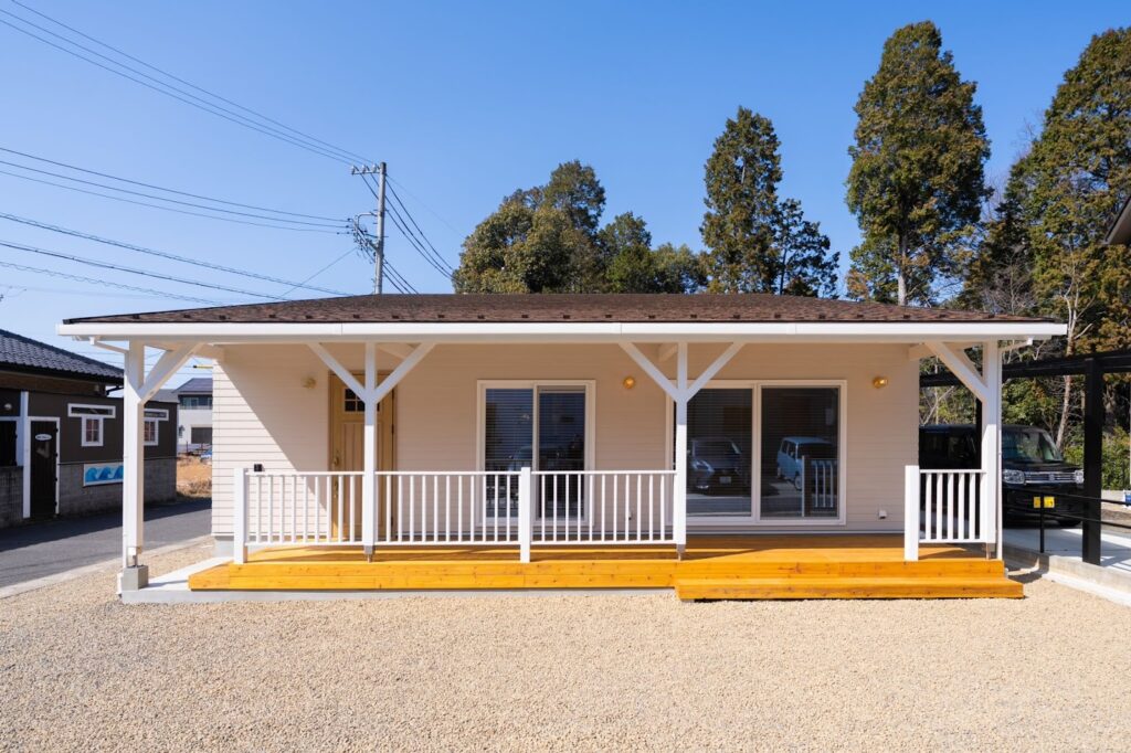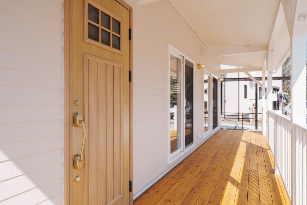 こだわったポイントはいくつもありますが、特に気に入っているのは家の前面に設けたカバードポーチです。玄関からウッドデッキまで一体になったような広いスペースで、家の端から端までドーンと広がる設計にしてもらいました。白を基調に木目をアクセントにした外観と相まって、まさに理想としていた「海を感じられる家」になったと思います。